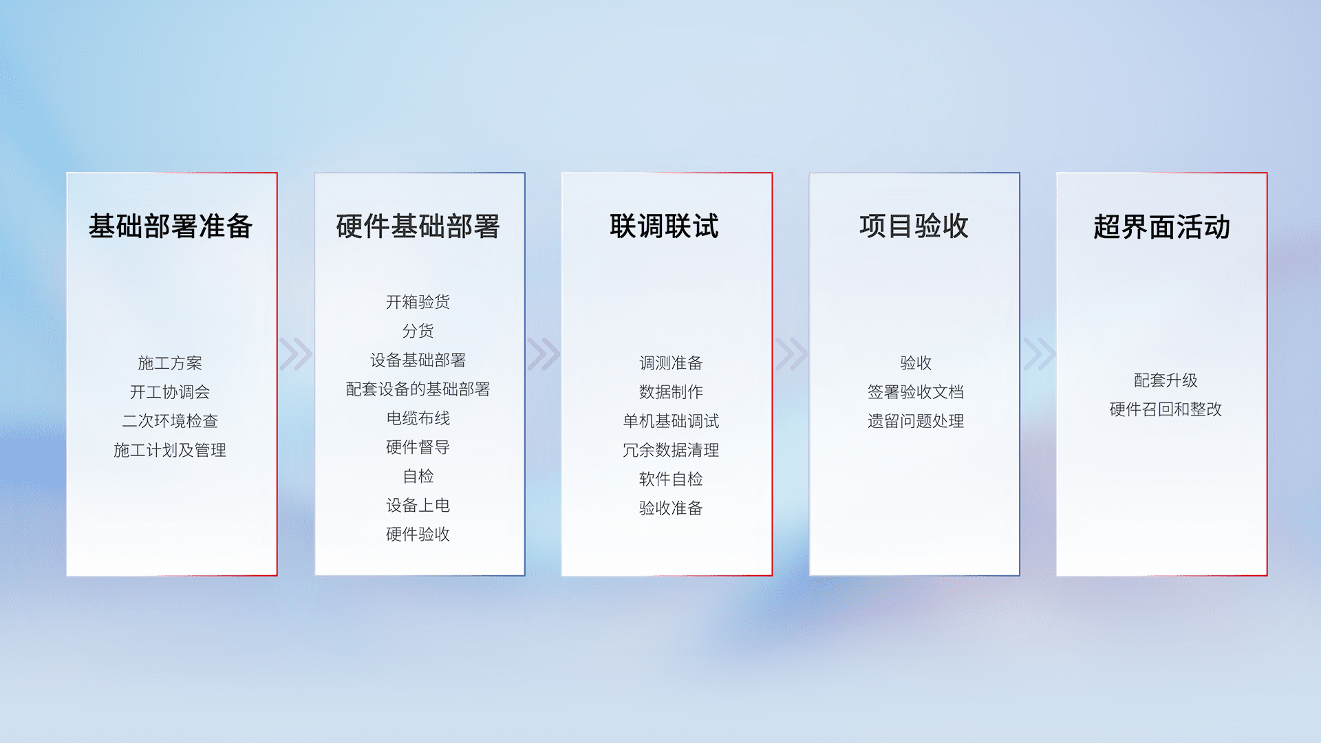从基础部署准备、、硬件基础部署、、、联调联试、、、、项目验收、、、、越界面活动的全过程可追溯,,,保证施工质量和进度。。